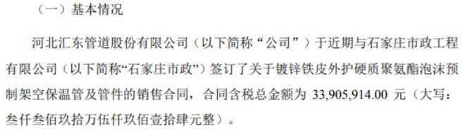 金年會(huì)金字招牌至上網(wǎng)站匯東管道簽訂了鍍鋅鐵皮外護(hù)硬質(zhì)聚氨酯泡沫預(yù)制架空保溫管及管件的銷(xiāo)售合同 含稅總金額為339059萬(wàn)挖貝網(wǎng)7月31日,匯東管道(836903)近日發(fā)布公告,河北匯東管道股份有限公司(以下簡(jiǎn)稱(chēng)“公司”)于近期與石家莊市政工程有限公司(以下簡(jiǎn)稱(chēng)“石家莊市政”)簽訂了關(guān)于鍍鋅鐵皮外護(hù)硬質(zhì)聚氨酯泡沫預(yù)制架空保溫管及管件的銷(xiāo)售合同,jinnianhui金年會(huì)合同含稅總金額為33,905,914.00元(大寫(xiě):叁仟叁佰玖拾萬(wàn)伍仟玖佰壹拾肆元整)。金年會(huì)官網(wǎng)登錄