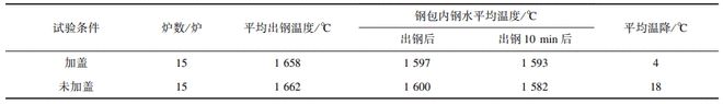 本次生產(chǎn)試驗在一煉鋼廠55#80t鋼包上應(yīng)用了全程加蓋技術(shù)。在轉(zhuǎn)爐出鋼側(cè)平臺加新鋼結(jié)構(gòu)平臺安裝反向插齒加揭蓋裝置,連續(xù)試驗15爐,出鋼溫度控制在1660±5℃,記錄轉(zhuǎn)爐出鋼10min后溫降情況,并與未加蓋數(shù)據(jù)進行對比,試驗結(jié)果如表4所示。
