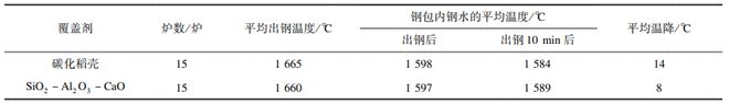 本次生產(chǎn)試驗選用一煉鋼廠45#80t鋼包,分別記錄使用碳化稻殼覆蓋劑、SiO2-Al2O3-CaO覆蓋劑鋼包鋼水溫降情況,出鋼溫度控制在1660±5℃,覆蓋劑按照1kg/t的加入量,出鋼10min后測溫,各試驗爐15爐。其中SiO2-Al2O3-CaO覆蓋劑成分如表2所示,溫度測量結(jié)果如表3所示。