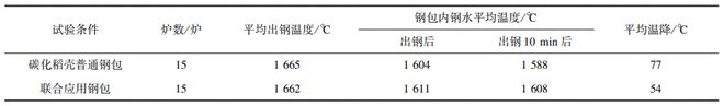 由表5看出,與碳化稻殼普通鋼包相比,應(yīng)用聯(lián)合保溫技術(shù)的鋼包內(nèi)的鋼水溫降平均少23℃,保溫效果良好。鋼包保溫效果的提升可適當(dāng)降低轉(zhuǎn)爐出鋼溫度,經(jīng)過一定時間的現(xiàn)場聯(lián)合應(yīng)用生產(chǎn)試驗后發(fā)現(xiàn):出鋼溫度每降低1℃,鐵水與廢鋼間的混合比減少0.054%,金屬收得率增加0.02%;出鋼溫度降低,提高了轉(zhuǎn)爐的耐材壽命,鋼包耐材的保溫減少了急冷急熱導(dǎo)致的耐材剝落,平均使用壽命延長10%以上;轉(zhuǎn)爐平均吹氧時間能夠減少1min,從而減少了煙氣排放,按2.5Nm3/℃噸鋼計算,年產(chǎn)400萬t的鋼廠降低出鋼溫度10℃可減少1×108Nm3廢氣排放。