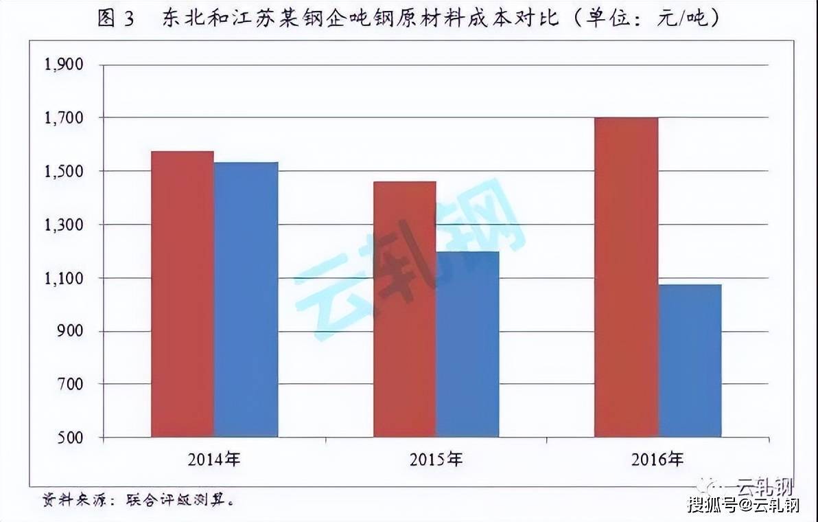 自有礦山對鋼鐵企業(yè)原材料供應的穩(wěn)定性保障,但在國際鐵礦石價格持續(xù)下滑的整體背景下,國內礦山成本劣勢過大對鋼鐵企業(yè)價格競爭力形成較大拖累。以東北某鋼鐵企業(yè)和江蘇某鋼鐵企業(yè)為例:2014年,具備自有礦山的東北某鋼鐵企業(yè)和江蘇某鋼鐵企業(yè)原材料成本差異較小,分別為1,577.31元/噸和1,533.57元/噸。東北某鋼鐵企業(yè)下屬鐵礦有限公司具備較大規(guī)模的自備鐵精礦儲量,雖然東北某鋼鐵企業(yè)自供鐵礦石水平也處于較低的20%左右,但江蘇某鋼鐵企業(yè)的鐵礦石則全部采自海外。2015年以來,兩者噸鋼原材料成本呈現明顯分化;東北某鋼鐵企業(yè)噸鋼原材料成本波動上漲而江蘇某鋼鐵企業(yè)持續(xù)下行。