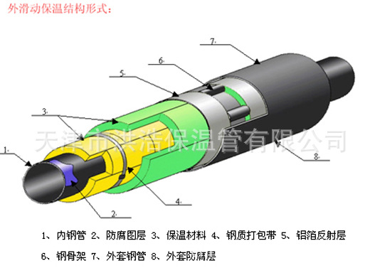 ?。?)外護管:保護保溫層免受地下水侵蝕、支撐芯管并能承受一定壓力的外防護層。依材料不同,一般分成鋼外護管、高密度聚乙烯塑料外護管、玻璃纖維增強塑料外護管、復合外護管等。本產品一般采用鋼管作為外護管,尤其在高水位或地表水豐富的地區(qū),必須采用鋼外護管。鋼外護管材料性能和公差尺寸,符合相關國家或行業(yè)標準。鋼管外表面需拋丸除銹處理。(6)防腐層:防止土壤腐蝕的保護層。本產品一般采用玻璃絲纏繞環(huán)氧樹脂或特加強級環(huán)氧煤瀝青防腐結構(三布四油)作為外鋼管的防腐層。特殊情況下,可采用二層結構或三層結構的聚乙烯防腐層。必要時可輔以“陰極保護”措施。