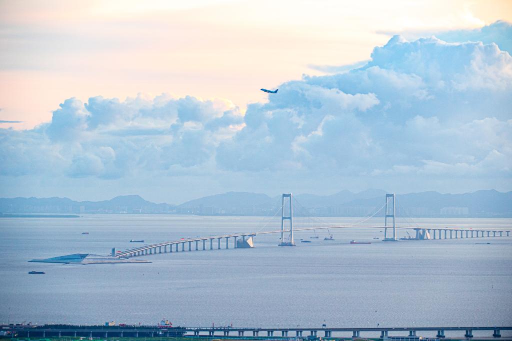 6月23日,從深圳寶安國(guó)際機(jī)場(chǎng)起飛的飛機(jī)飛過深中通道。新華社記者 毛思倩 攝