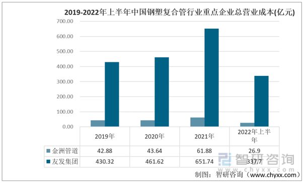 從兩家企業(yè)近年來(lái)各自的營(yíng)業(yè)成本來(lái)看,兩家企業(yè)的總營(yíng)業(yè)成本都呈現(xiàn)上漲的趨勢(shì)。其中,2022年上半年金洲管道、友發(fā)集團(tuán)各自的總營(yíng)業(yè)成本分別為26.9億元以及337.7億元。