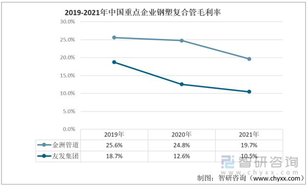 對(duì)比金洲管道和友發(fā)集團(tuán)的鋼塑復(fù)合管毛利率情況,2019-2021年兩家企業(yè)該業(yè)務(wù)的毛利率都呈現(xiàn)下降的趨勢(shì),但是友發(fā)集團(tuán)該業(yè)務(wù)的毛利率始終高于金洲管道。2021年,金洲管道、友發(fā)集團(tuán)各自的毛利率分別為19.7%以及10.5%。