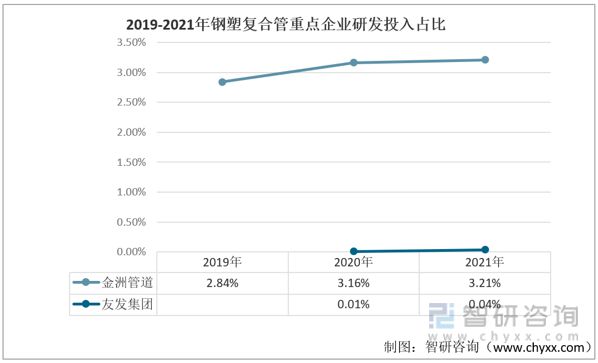 從研發(fā)投入金額情況來(lái)看,金洲管道和友發(fā)集團(tuán)都呈現(xiàn)穩(wěn)步上漲的趨勢(shì),2021年金洲管道和友發(fā)集團(tuán)研發(fā)投入金額分別為2.26億元以及0.24億元,金洲管道的研發(fā)投入金額遠(yuǎn)遠(yuǎn)高于友發(fā)集團(tuán);從研發(fā)投入占比來(lái)看,2021年創(chuàng)物流和友發(fā)集團(tuán)研發(fā)投入占比為3.21%以及0.04%。