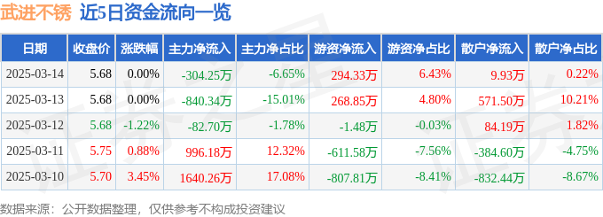 jinnianhui金年會(huì)官方網(wǎng)站入口股票行情快報(bào):武進(jìn)不銹(603878)3月14日主力資金凈賣(mài)出30425萬(wàn)元證券之星消息,截至2025年3月14日收盤(pán),武進(jìn)不銹(603878)報(bào)收于5.68元,上漲0.0%,換手率1.44%,成交量8.1萬(wàn)手,成交額4574.43萬(wàn)元。