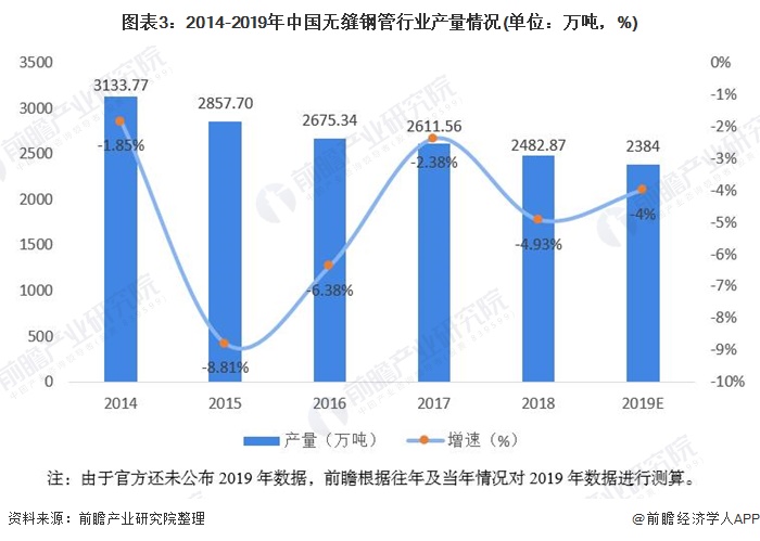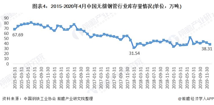 在“減產(chǎn)提質(zhì)”的主基調(diào)下,2014-2019年,我國無縫鋼管行業(yè)產(chǎn)量逐漸下滑,2019年無縫鋼管產(chǎn)量約為2384萬噸。也正因如此,我國無縫鋼管庫存量呈現(xiàn)波動下降的趨勢,由2015年年初的67.69萬噸下滑至2019年年末的38.31萬噸,其中最低庫存量低至31.54萬噸。