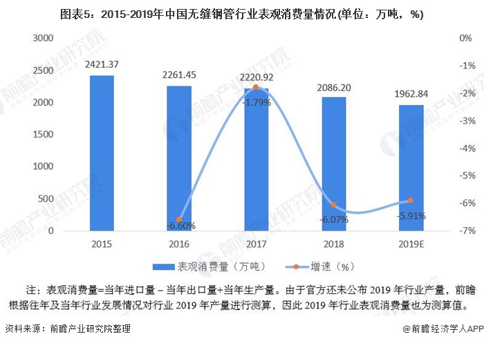 在消費端,船舶制造行業(yè)三大造船指標(biāo)整體呈下降趨勢,汽車產(chǎn)業(yè)近年來產(chǎn)量有所下滑,對我國無縫鋼管消費量產(chǎn)生一定的影響。不過,國際油價提振,國內(nèi)石油開采力度增強;以及發(fā)電設(shè)備產(chǎn)量基本穩(wěn)定等,對國內(nèi)無縫鋼管消費量形成一定的支撐。2015-2019年,我國無縫鋼管表觀消費量下滑速度較產(chǎn)量較慢,2019年我國無縫鋼管表觀消費量為1962.84萬噸。