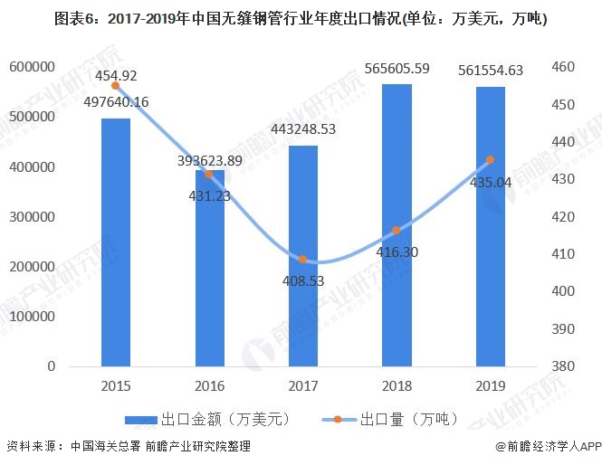 在進出口方面,2015-2019年,我國出口無縫鋼管數(shù)量和出口金額均呈現(xiàn)先下降后上升的趨勢,但不同的是,2017年我國出口無縫鋼管數(shù)量持續(xù)下降的背景下,我國無縫鋼管出口金額呈上升趨勢,其主要原因是2017年我國無縫鋼管單價有所提高。2019年,我國無縫鋼管出口量和出口金額分別為435.04萬噸和561554.63萬美元。