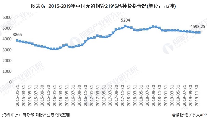 在價格方面,受益于庫存壓力下降、原材料價格上漲等,2015-2019年,我國無縫鋼管價格呈波動上升趨勢。以無縫鋼管219*6品種價格為例,其價格從2015年年初的3865元/噸上漲至2019年年末的4593.25元/噸,漲幅超過18%。