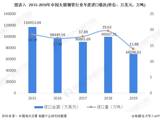在進口數(shù)量上,2015-2018年,我國進口無縫鋼管數(shù)量在20萬噸左右;2019年呈現(xiàn)下滑趨勢,進口數(shù)量為13.88萬噸。在進口金額上,2015-2019年,我國進口無縫鋼管金額呈現(xiàn)先下降后上升再下降的趨勢,2019年下滑至69296.61萬美元。2019年進口數(shù)量和進口金額均出現(xiàn)大幅下降的主要原因是我國對原產(chǎn)于美國和歐盟的進口相關(guān)高溫承壓用合金鋼無縫鋼管所適用的反傾銷措施進行期終復(fù)審調(diào)查。