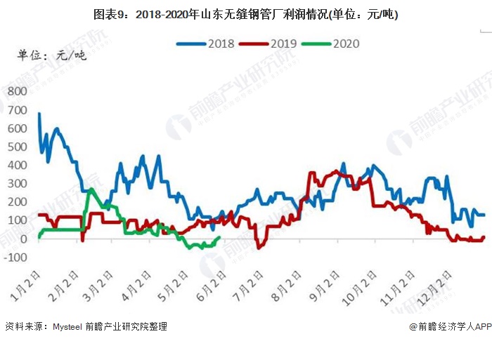 但是,由于無縫鋼管行業(yè)產(chǎn)能過剩、產(chǎn)品同質(zhì)化等問題依然存在,因此近年來行業(yè)利潤仍有小幅下滑的趨勢。jinnianhui金年會官網(wǎng)以我國生產(chǎn)主要無縫鋼管地區(qū)山東無縫鋼管廠為例,2018-2020年5月,山東無縫鋼管廠利潤整體呈下降趨勢。