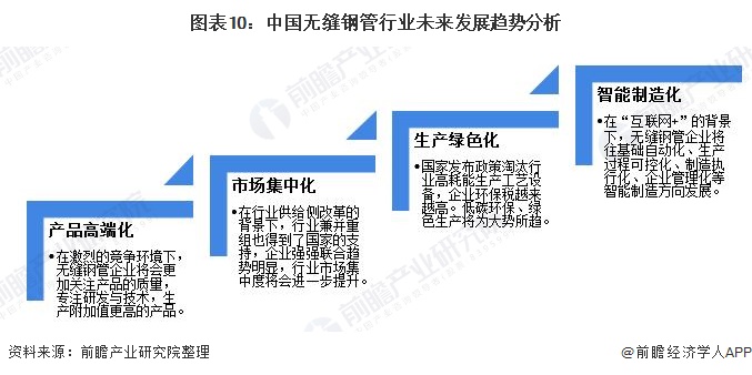 總的來看,我國無縫鋼管行業(yè)在轉(zhuǎn)型升級階段已經(jīng)取得了一定的成效,但離成為全球無縫鋼管生產(chǎn)強國仍有一定的距離,我國無縫鋼管企業(yè)仍需努力。在供給側(cè)的改革背景下,企業(yè)應(yīng)當(dāng)堅持摒棄以量取勝的發(fā)展道路,而更應(yīng)關(guān)注產(chǎn)品的附加值,打造高質(zhì)量產(chǎn)品。前瞻認(rèn)為,在未來的發(fā)展趨勢上,我國無縫鋼管行業(yè)將往產(chǎn)品高端化、市場集中化、生產(chǎn)綠色化和智能制造化等方向發(fā)展。
