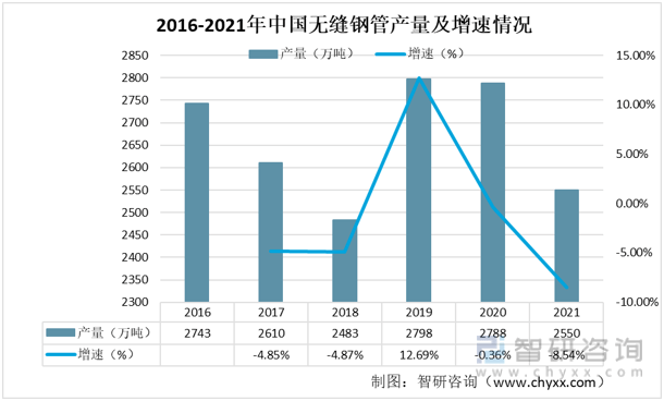 我國(guó)已是世界鋼管生產(chǎn)和消費(fèi)大國(guó)。無(wú)縫鋼管產(chǎn)量超過(guò)全球產(chǎn)量65%;出口量占我國(guó)無(wú)縫鋼管產(chǎn)量15%;占世界無(wú)縫鋼管總產(chǎn)量的10%。據(jù)統(tǒng)計(jì),2021年中國(guó)無(wú)縫鋼管產(chǎn)量大約為2550萬(wàn)噸,較2020年統(tǒng)計(jì)的2788萬(wàn)噸減少238萬(wàn)噸,產(chǎn)量變化在一定區(qū)間內(nèi)震蕩,整體較為平緩。綜合來(lái)看,國(guó)內(nèi)無(wú)縫鋼管產(chǎn)能過(guò)剩的情況尤為明顯。