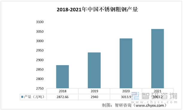 隨著我國(guó)經(jīng)濟(jì)的快速發(fā)展、不銹鋼管應(yīng)用市場(chǎng)的持續(xù)繁榮和行業(yè)技術(shù)的日益進(jìn)步,我國(guó)不銹鋼管制造業(yè)獲得了長(zhǎng)足發(fā)展,隨著工業(yè)化進(jìn)程的推進(jìn),以及不銹鋼下游應(yīng)用領(lǐng)域的不斷增強(qiáng),近年來(lái)我國(guó)不銹鋼產(chǎn)量穩(wěn)居全球第一,整體保持增長(zhǎng)態(tài)勢(shì)。2020年,中國(guó)不銹鋼粗鋼產(chǎn)量總計(jì)3013.9萬(wàn)噸,較上年增加73.9萬(wàn)噸,同比增長(zhǎng)2.5%;2021年,中國(guó)不銹鋼粗鋼產(chǎn)量達(dá)3063.2萬(wàn)噸,較上年增加49.3萬(wàn)噸,同比增長(zhǎng)1.64%。
