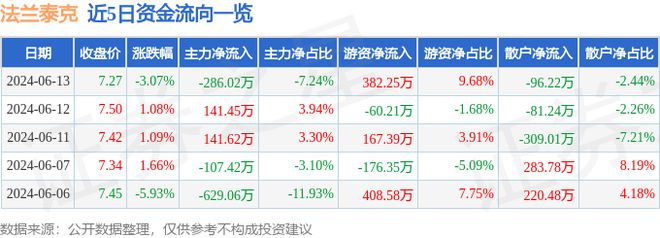 6月13日的資金流向數(shù)據(jù)方面,主力資金凈流出286.02萬元,占總成交額7.24%,游資資金凈流入382.25萬元,占總成交額9.68%,散戶資金凈流出96.22萬元,占總成交額2.44%。
