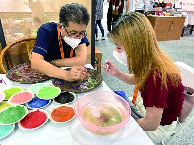 9月1日,在服貿(mào)會首鋼園展區(qū)的文旅服務專題展上,北京琺瑯廠體驗中心梁軍(左)向參觀者傳授“點藍”技藝。光明網(wǎng)記者 張倩攝/光明圖片