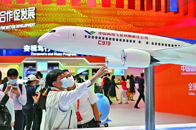9月1日,觀眾在國家會議中心的中國服務貿(mào)易成就展專區(qū)內(nèi)參觀C919飛機模型。新華社記者 李鑫攝