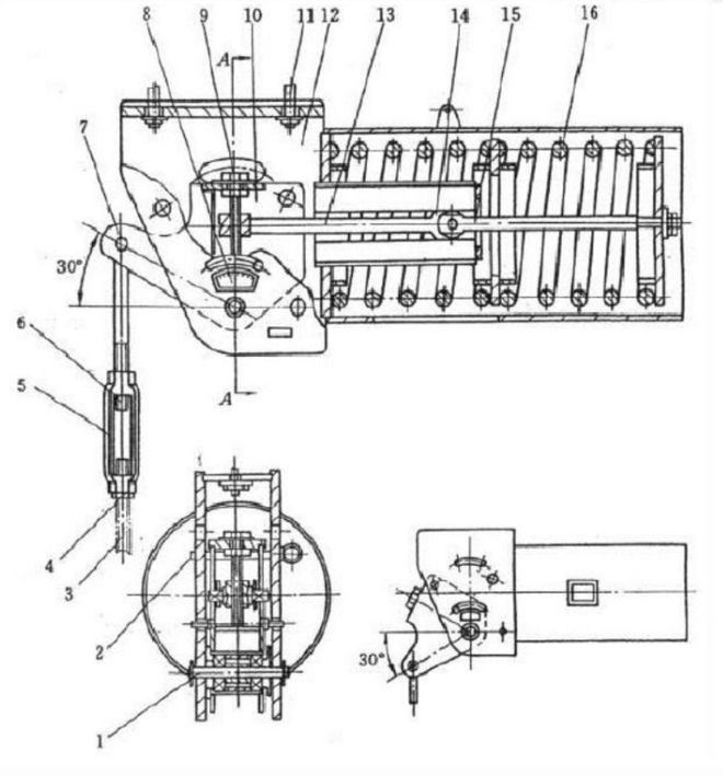 3.1恒力架結構及工作原理典型恒力吊架結構如圖3,它由固定框架12(外殼)彈簧16、載荷調節(jié)器9、轉動體(回轉框架) 10等組成轉動體繞主軸1可以在外殼中轉動,外殼通過生根螺栓11與槽鋼吊架根部相聯(lián)結。轉動體的一端通過掛孔7與吊桿3及載荷螺栓6等聯(lián)結、吊桿可以沿掛孔轉動(通常轉動體有多個掛孔,分布在以主軸1為中心的同一輻射半徑上)轉動體中有荷載調節(jié)器螺栓,彈簧力通過拉板13及拉桿螺栓15作用在載荷調節(jié)器9的調整螺栓中部位置。彈簧固定在外殼上,彈簧力由拉桿螺栓傳給拉板,二者之間活動聯(lián)結