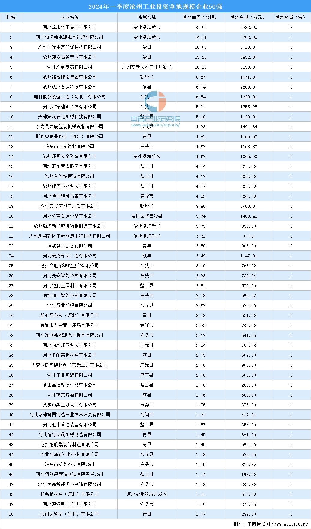 金年會官網(wǎng)注冊投資情報(bào) · 滄州篇 2024年一季度滄州這50家企業(yè)工業(yè)土地投資規(guī)模最大中商情報(bào)網(wǎng)訊:2024年一季度滄州工業(yè)投資拿地規(guī)模企業(yè)50強(qiáng)出爐,拿地面積累計(jì)248.27公頃,拿地金額6.89億元,拿地?cái)?shù)量52宗。