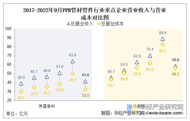 2022年1-9月,偉星新材總營(yíng)業(yè)收入為41.6億元,同比增長(zhǎng)3.4%;公元股份的總營(yíng)收(58.6億元)較上年同期下降8.0%。此外,偉星新材(32.5億元)的2022年1-9月企業(yè)總營(yíng)業(yè)成本低于公元股份(56.3億元),同比變化率分別為4.3%、-5.6%。