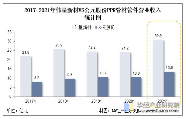分企業(yè)來看,偉星新材的2021年P(guān)PR管材管件行業(yè)營(yíng)收30.9億元,同比增長(zhǎng)27.6%;公元股份則是營(yíng)收13.6億元,較上年增長(zhǎng)28.5%。